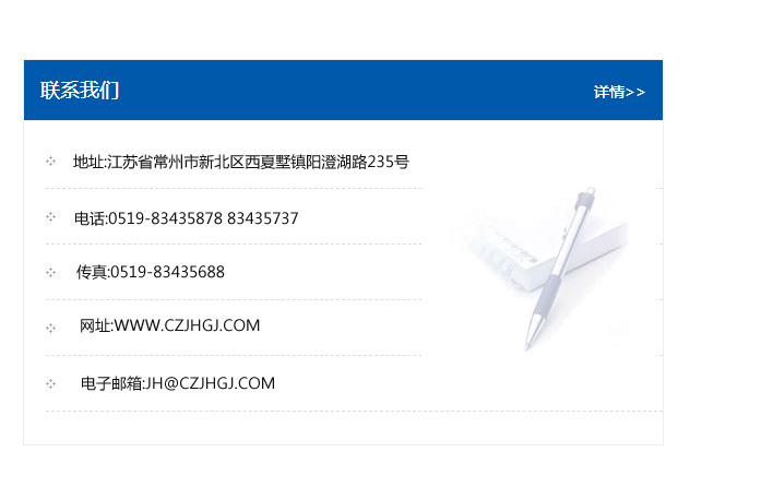 傳真:0519-83435688    郵編:213135    網址:WWW.czjhgj_com.gzahrd.com    電子郵箱:JH@czjhgj_com.gzahrd.com